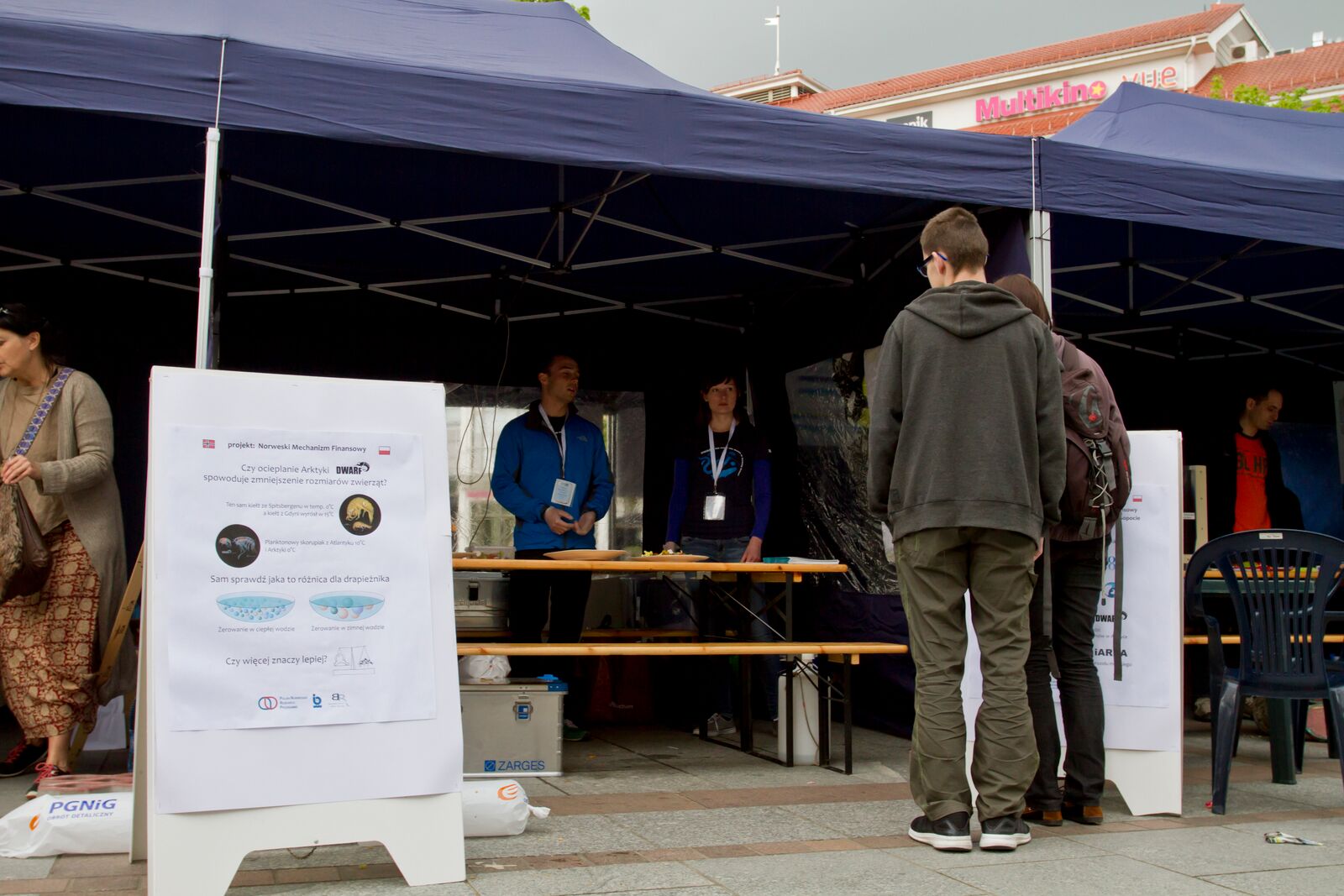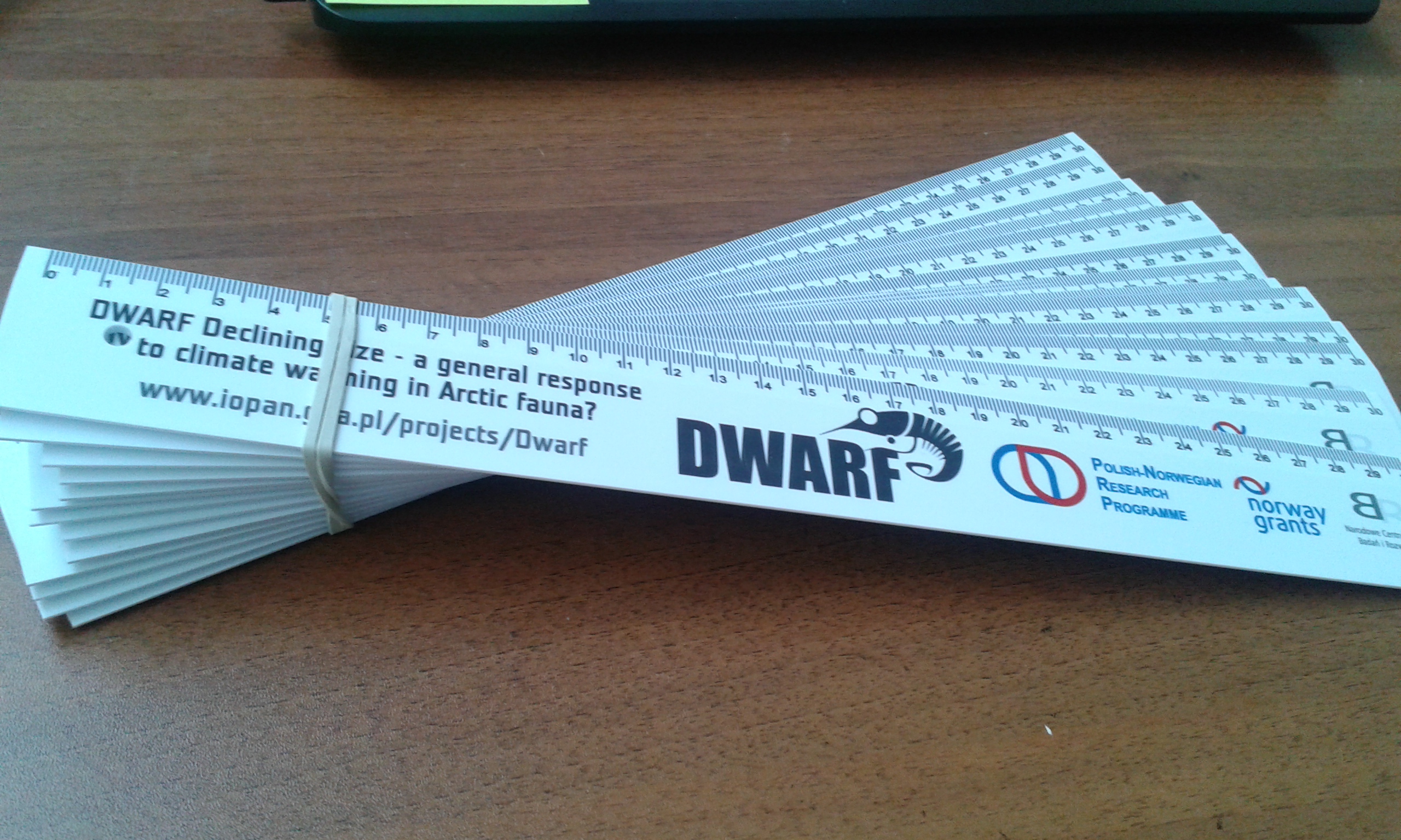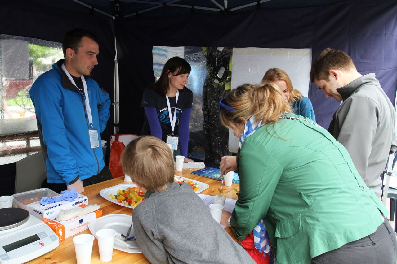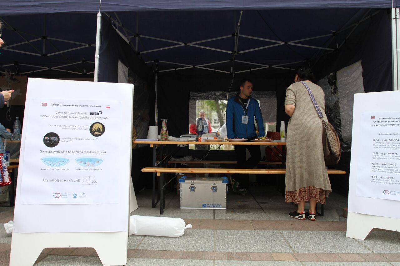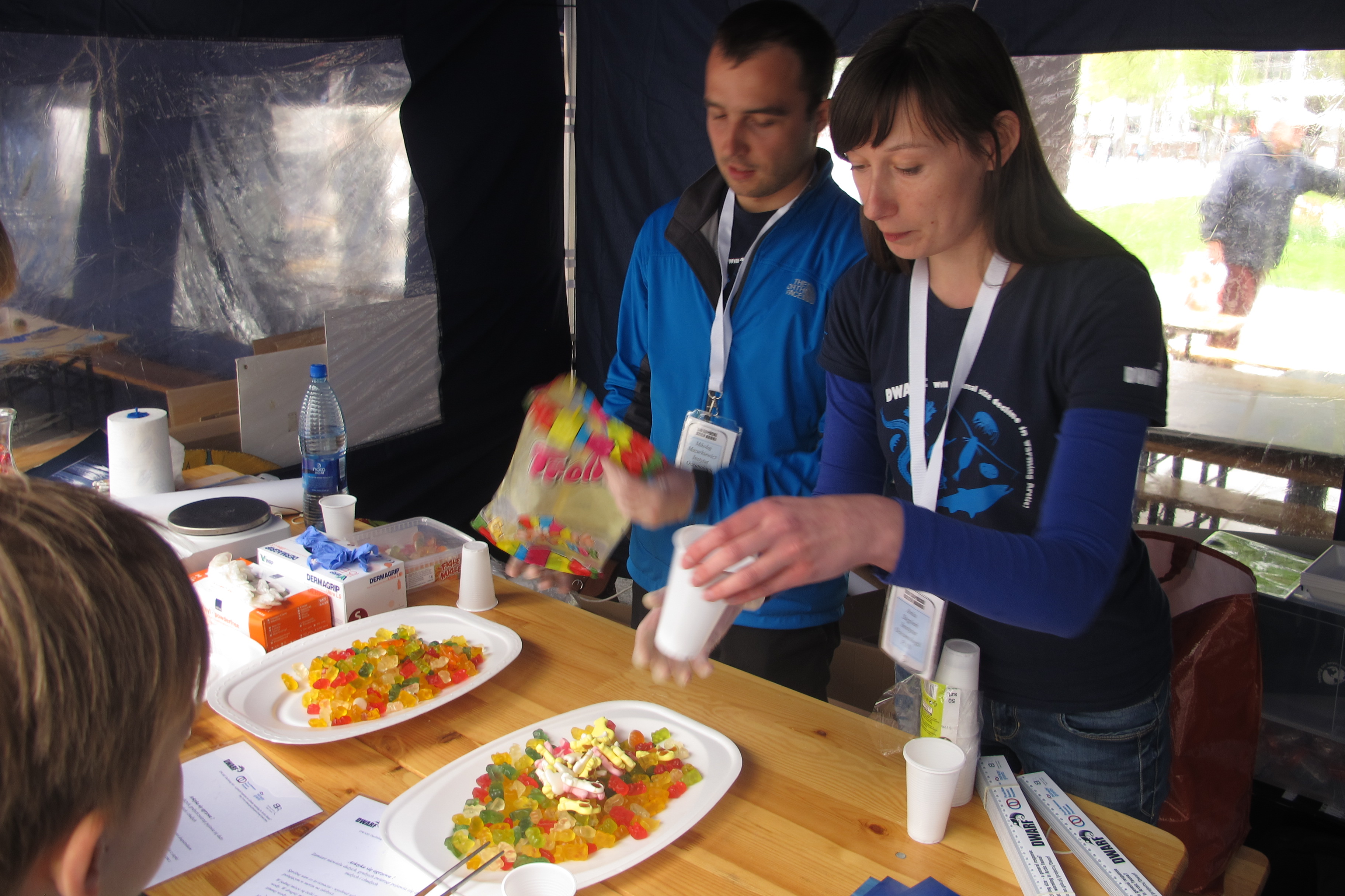 At the Polish-Norwegian Projects' box we were presenting our project objectives. Using jelly beans we created two "ecosystems", a warm-climate one with small organisms (only small jellies) and a cold-climate one with small and large organisms (small and large jellies). Than we asked the participants to imagine that they were predators catching the prey and catch as much food as possible in 5 strikes. They clearly saw that in cold-climate ecosystem it is much easier to feed on. After the hunting, participants could take their "prey" with them and get a little gift from us - a ruler with DWARF logo.