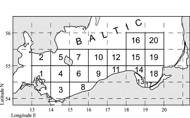 The radiation transfer model developed at IO PAS, Sopot, was applied to determine the main radiation fluxes. A long-term meteorological and bio-optical standard database has been used in the computations. The mean monthly fluxes Qi and their balance Q15 = Q9 - Q14 for the Southern Baltic region, divided into 20 sub-regions (see the map below), have been obtained for each month of the year.