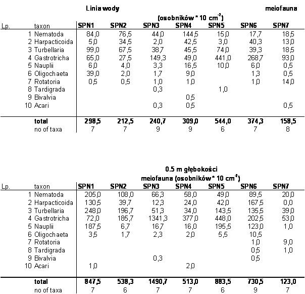Skład taksonomiczny i liczebność wyższych taksonów meiofauny w czerwcu 2006 roku na linii wody